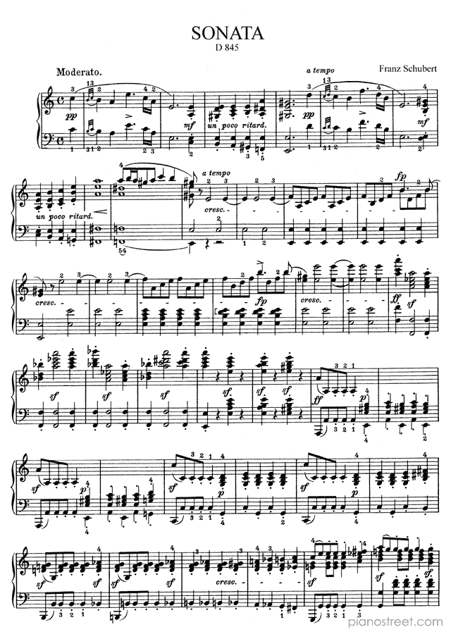 Sonata 16 in A Minor Op. 42 D. 845 by Franz Schubert. Sheet music and recordings of thousands of piano pieces by Franz Schubert and many other famous composers to view in your digital device, print out or listen to.