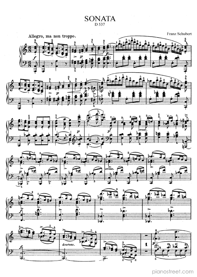 Classical piano sheet music by Schubert to download: Sonata 4 Op. 164 D. 537 in the key of This piece has difficulty level 8+ in the category Sonata