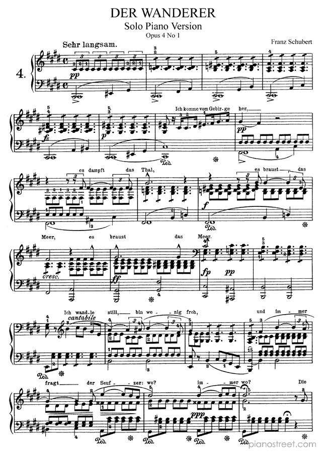Schubert: Der Wanderer - solo piano version Op. 4 No. 1 in C-sharp Minor . DOWNLOAD piano sheet music from Piano Street digital sheet music library.
