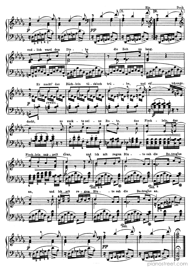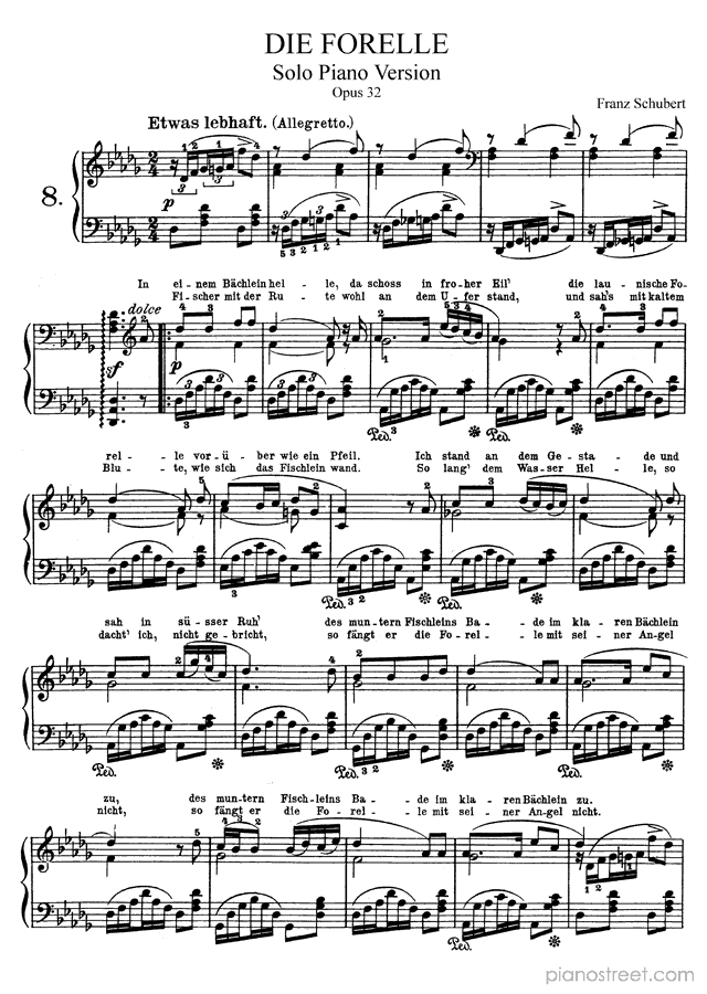 DOWNLOAD Die Forelle - solo piano version in D-flat Major Op. 32 by Franz Schubert. High quality classical piano scores from the Piano Street sheet music library.