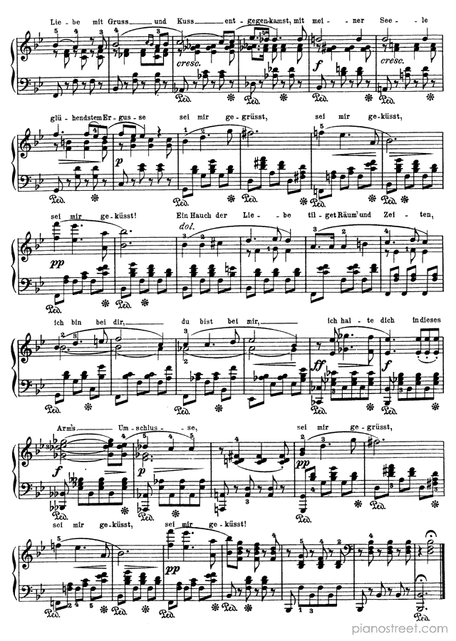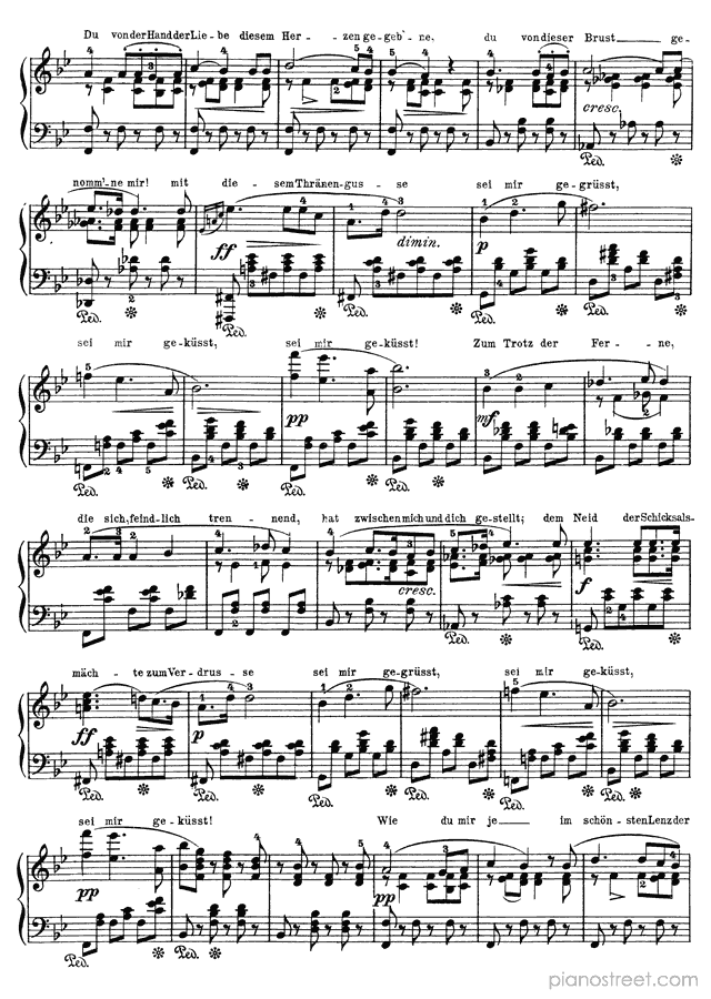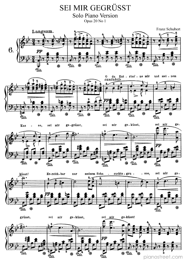 Sei mir gegrüsst - solo piano version in B-flat Major - Op. 20 No. 1 is a piano piece by the early romantic composer Franz Schubert who lived between the years 1797 and 1828.