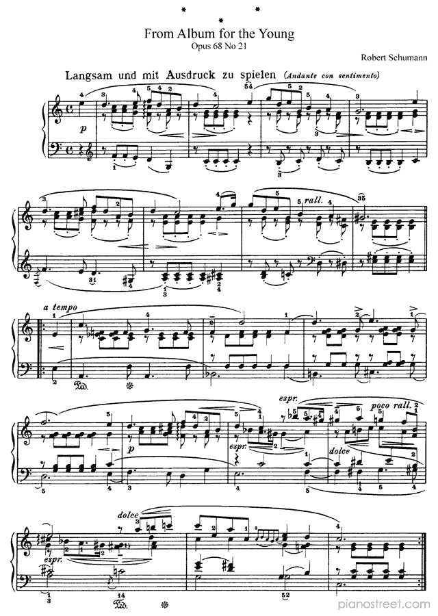 Langsam und mit Ausdruck zu spielen in C Major Op. 68 No. 21 by Robert Schumann. Sheet music and recordings of thousands of piano pieces by Robert Schumann and many other famous composers to view in your digital device, print out or listen to.
