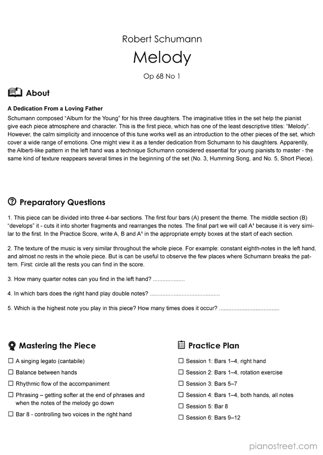 The simplicity and innocence of this Melody is a very fitting introduction to the other pieces of this popular set, picturing a wide range of children's ideas, games and emotions. One might view it as a tender dedication from Schumann to his daughter. As the title suggests, the main interest of the piece is in the right hand cantabile and phrasing. But it's also worth noting the Alberti-like acompaniment pattern. Apparently, this was an technique Schumann considered essential for young pianists to master - the same kind of texture reappears several times in the beginning of the set (no. 3, Humming Song, and no. 5, Short Piece)Background