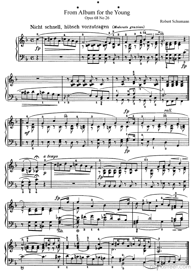 Nicht schnell, hübsch vorzutragen in F Major - Op. 68 No. 26 is a piano piece by the early romantic composer Robert Schumann who lived between the years 1810 and 1856.