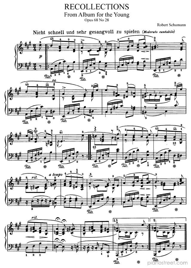 Recollections Op. 68 No. 28 in A Major, a composition by the early romantic composer Robert Schumann who was born in 1810 and died in 1856. The piano score of this piece was first published in 1848 and is part of Schumann's Album for the Young.
