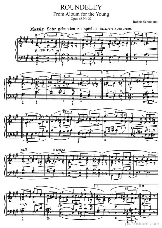 Roundelay in A Major Op. 68 No. 22 by Robert Schumann. Sheet music and recordings of thousands of piano pieces by Robert Schumann and many other famous composers to view in your digital device, print out or listen to.