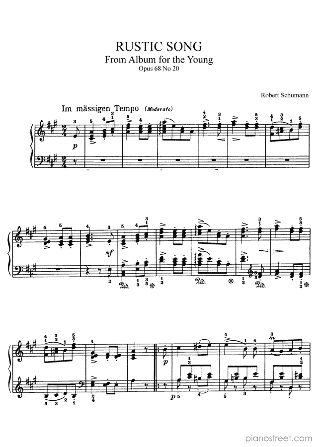 Schumann: Rustic Song Op. 68 No. 20 in A Major (published in 1848) . DOWNLOAD piano sheet music from Piano Street digital sheet music library.