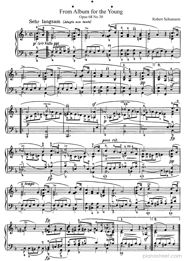 DOWNLOAD: Robert Schumann - Sehr Langsam Op. 68 No. 30 in F Major ( from Album for the Young by Schumann). Piano sheet music to print immediately or to view in mobile devices.