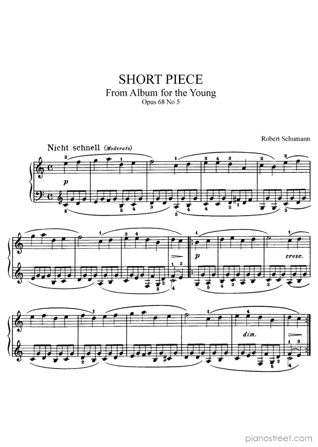 DOWNLOAD Short Piece in C Major Op. 68 No. 5 by Robert Schumann (published in 1848) . High quality classical piano scores from the Piano Street sheet music library.