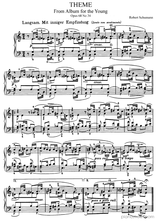 Theme in C Major Op. 68 No. 34 by Robert Schumann. Sheet music and recordings of thousands of piano pieces by Robert Schumann and many other famous composers to view in your digital device, print out or listen to.