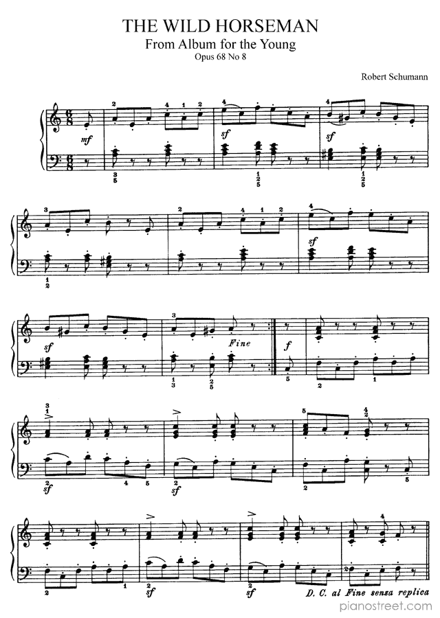 Early Romantic piano sheet music by Robert Schumann to download and print instantly: The Wild Horseman Op. 68 No. 8 in the key of . Level 3, compositional type: Piece (published in 1848)