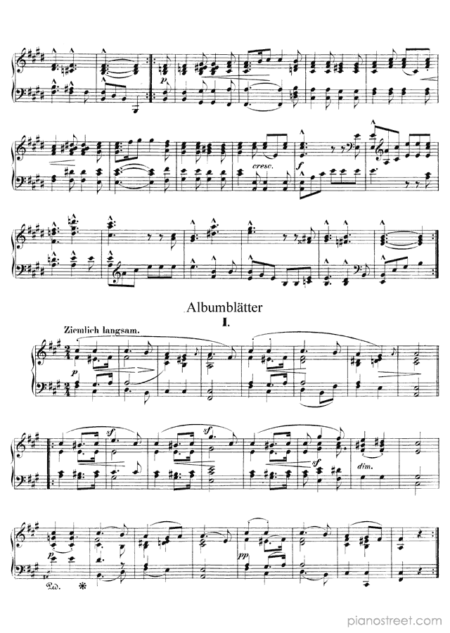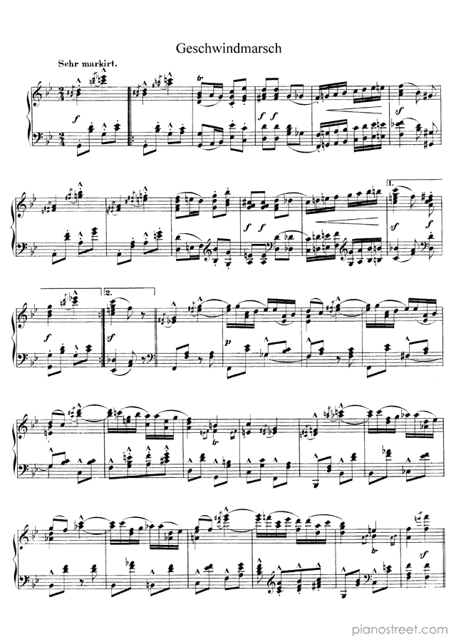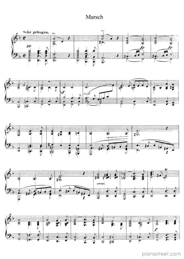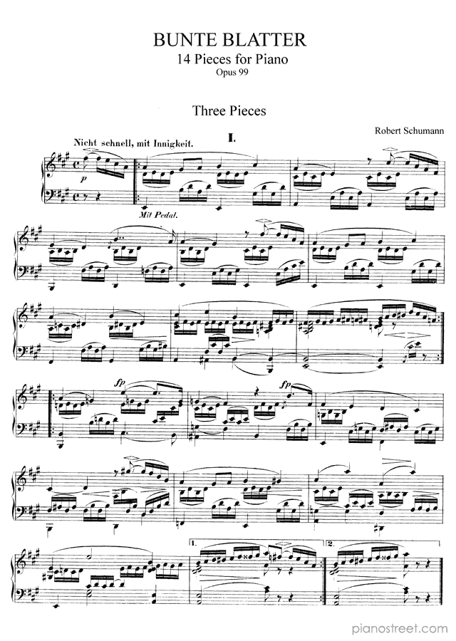 Piano sheet music downloads and recordings. This piece is from Bunte Blätter by Robert Schumann: Marsch Op. 99 No. 11 in D Minor (published in 1839) . Level 8+, Period: Early Romantic
