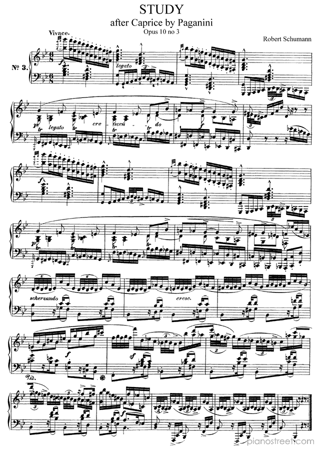 Robert Schumann, one of the composers active in the Early Romantic era, wrote this piece titled Caprice Op. 10 No. 3 in G Minor from Concert-Etudes after Caprices by Paganini. The composition is categorized as "Study" in Piano Street's sheet music library and the level of difficulty is 8+.
