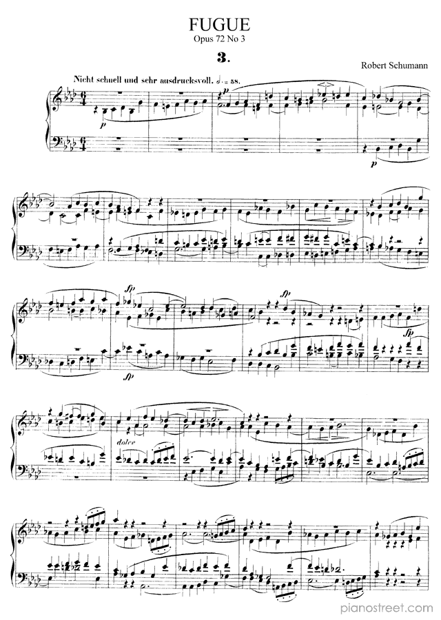 Early Romantic piano sheet music by Robert Schumann to download and print instantly: Fugue 3 Op. 72 No. 3 in the key of . Level 7, compositional type: Piece (published in 1845)