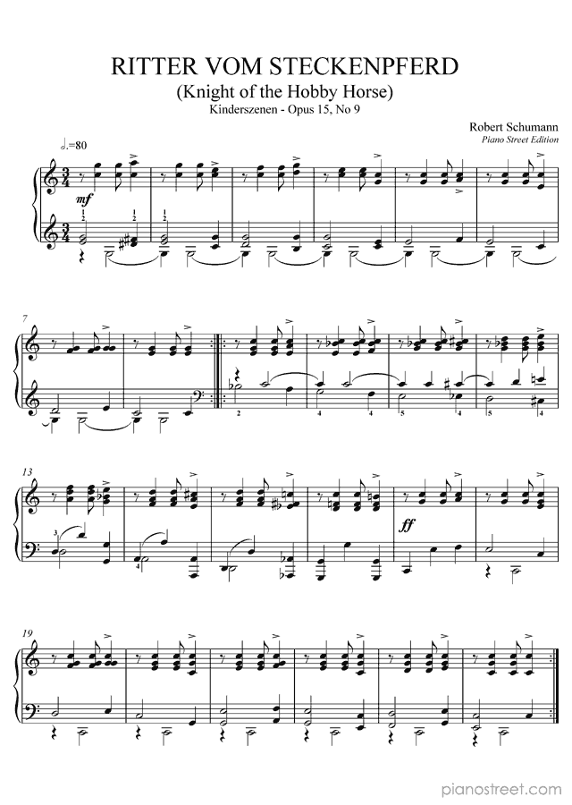 Early Romantic piano sheet music by Robert Schumann to download and print instantly: Ritter vom Steckenpferd Op. 15 No. 9 in the key of . Level 8, compositional type: Piece (published in 1839)