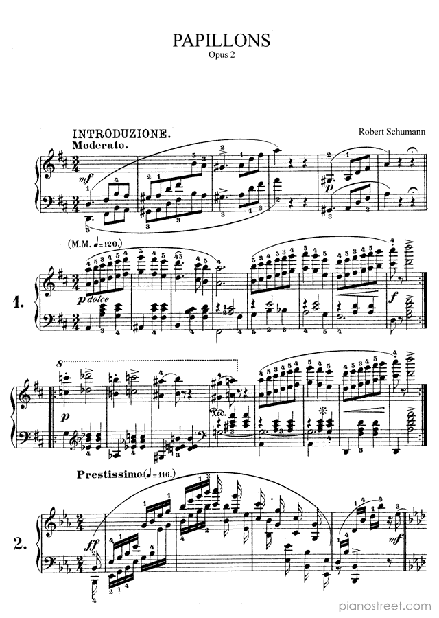 Papillons Op. 2, a composition by the early romantic composer Robert Schumann who was born in 1810 and died in 1856. It was composed during the Early Romantic period and is part of Schumann's Miscellaneous pieces.