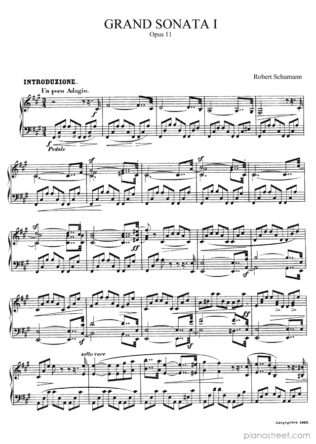 Piano sheet music downloads and recordings. This piece is by Robert Schumann: Grand Sonata 1 Op. 11 in F-sharp Minor (published in 1835) . Level 8+, Period: Early Romantic