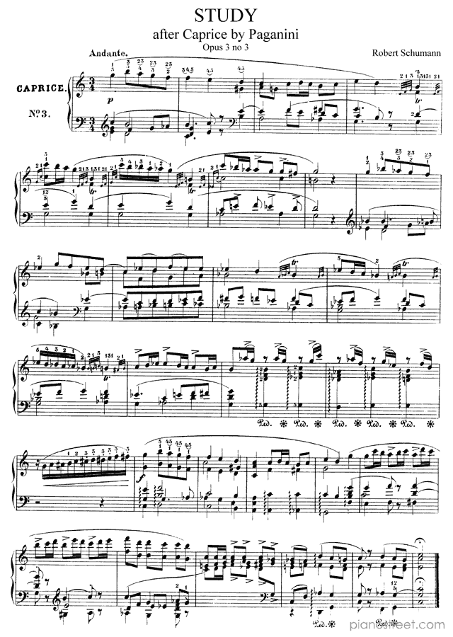 Piano sheet music downloads and recordings. This piece is from Studies after Caprices by Paganini by Robert Schumann: Caprice Op. 3 No. 3 in C Major . Level 8+, Period: Early Romantic