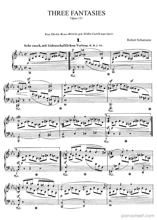 Piano sheet music downloads and recordings. This piece is from Three Fantasies by Robert Schumann: Fantasy Op. 111 No. 2 in A-flat Major (published in 1851) . Level 7, Period: Early Romantic