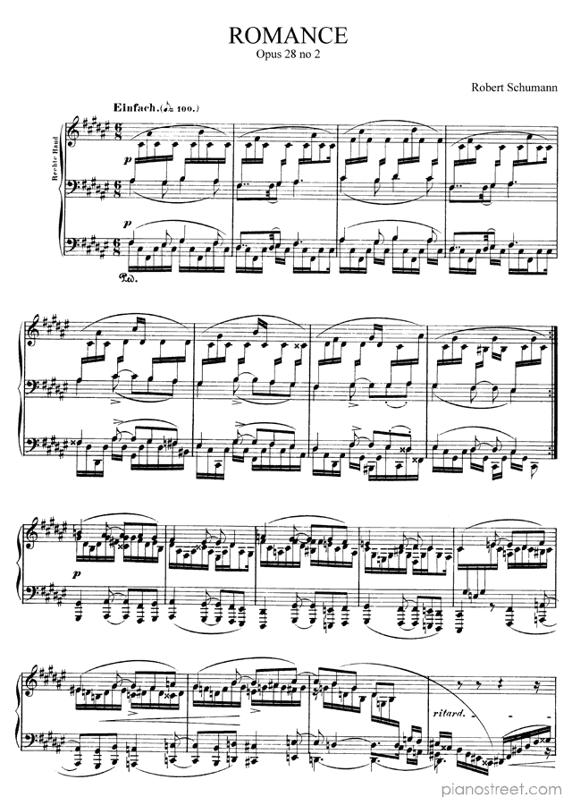 Early Romantic piano sheet music by Robert Schumann to download and print instantly: Romance Op. 28 No. 2 in the key of . Level 8+, composition type: Piece (published in 1839)