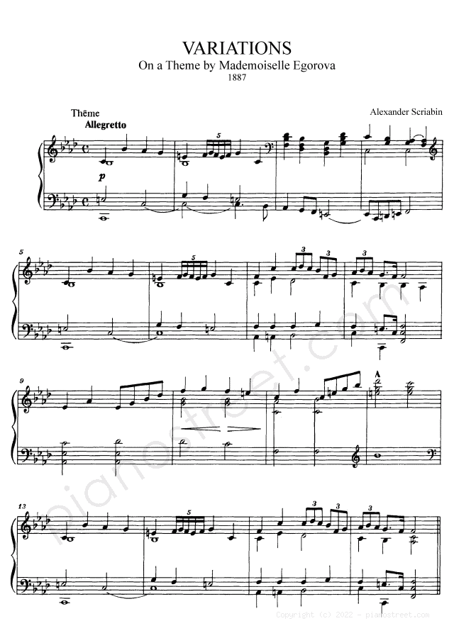 DOWNLOAD: Alexander Scriabin - Variations on a Theme by Egorova WoO 9 in F Minor ( by Scriabin). Piano sheet music to print immediately or to view in mobile devices.