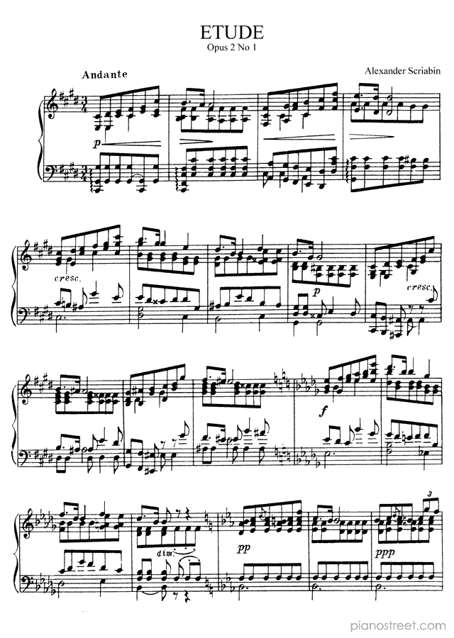 Scriabin’s 26 Études span the whole of his composing career, and this is the very first one, representing his youthful creative period, when he earned the nickname "the Russian Chopin". It was written before any of Scriabin's three whole sets of études, and was published together with a Prelude and an Impromptu to form the Three Pieces, Op. 2.Forum posts about this piece: