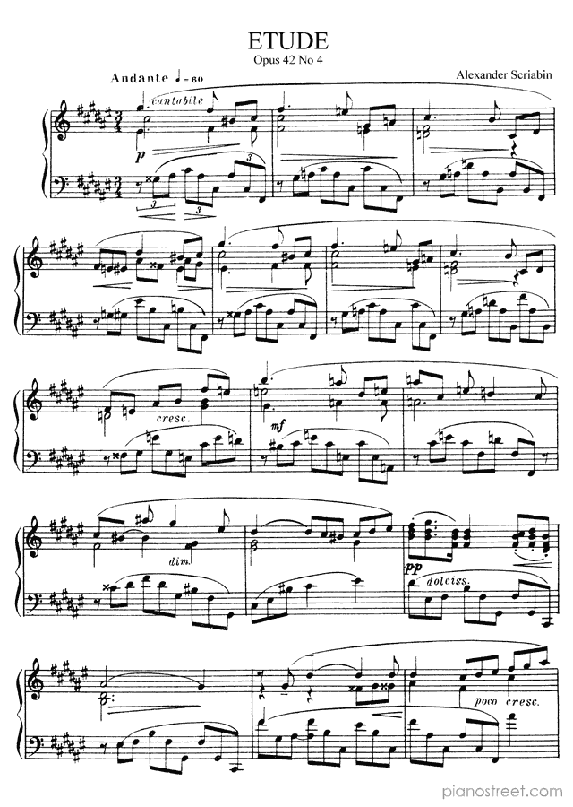 DOWNLOAD: Alexander Scriabin - Etude Op. 42 No. 4 in F-sharp Major ( from Etudes by Scriabin). Piano sheet music to print immediately or to view in mobile devices.