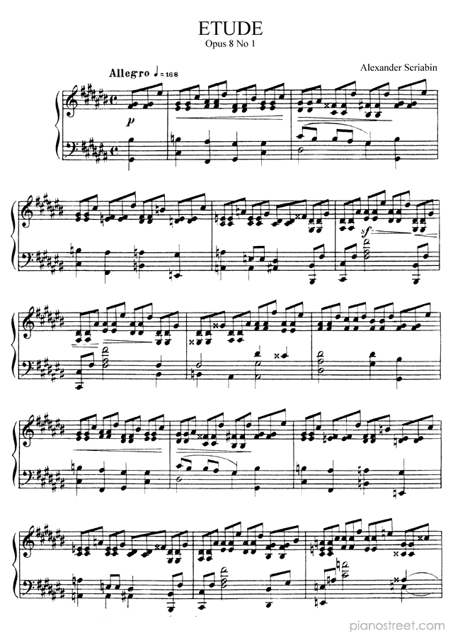 DOWNLOAD Etude in C-sharp Minor Op. 8 No. 1 by Alexander Scriabin (published in 1894) . High quality classical piano scores from the Piano Street sheet music library.
