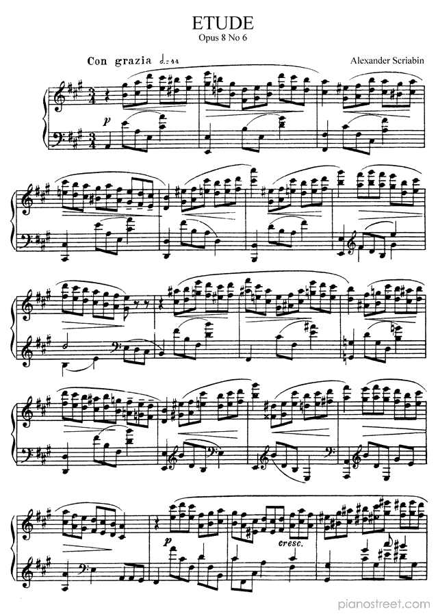 Alexander Scriabin: Etude Op. 8 No. 6 in A Major from Etudes - piano sheet music to print instantly. This piece is level 8+ and was composed during the Late Romantic period.