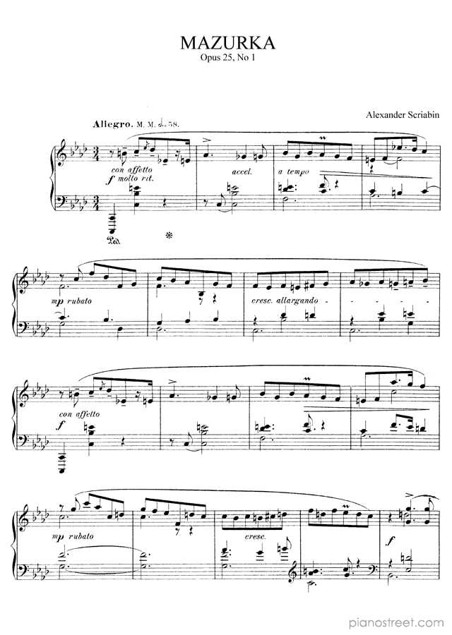 Mazurka in F Minor - Op. 25 No. 1 is a piano piece by the late romantic composer Alexander Scriabin who lived between the years 1872 and 1915.