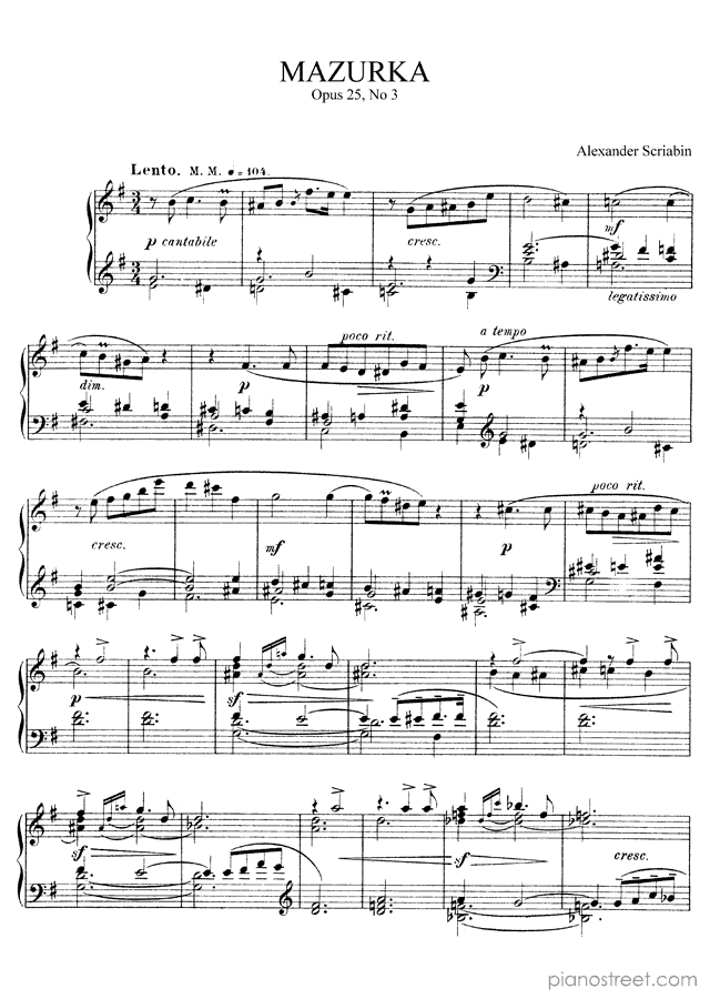 DOWNLOAD Mazurka in E Minor Op. 25 No. 3 by Alexander Scriabin (published in 1899) . High quality classical piano scores from the Piano Street sheet music library.