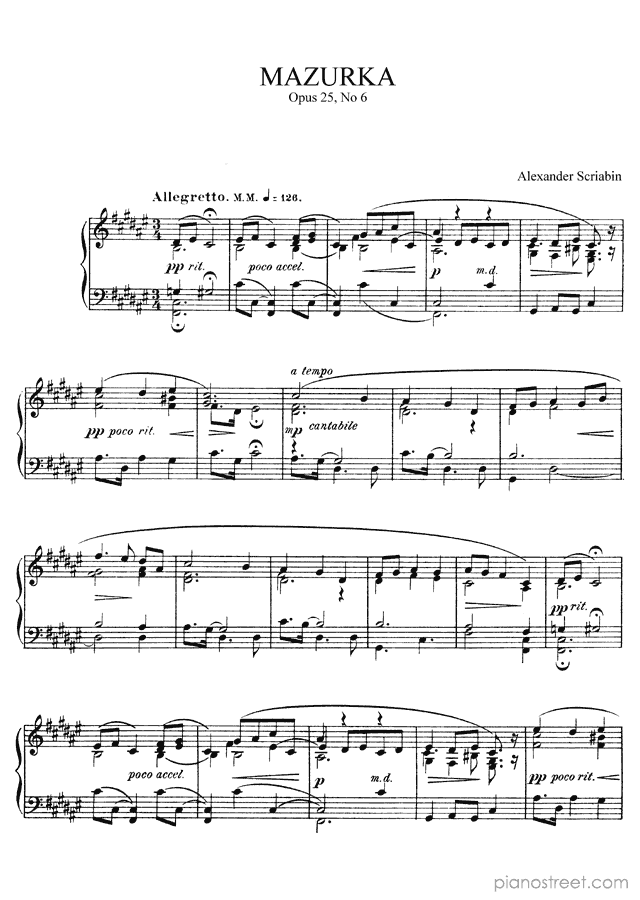 Late Romantic piano sheet music by Alexander Scriabin to download and print instantly: Mazurka Op. 25 No. 6 in the key of . Level 8, composition type: Piece (published in 1899)