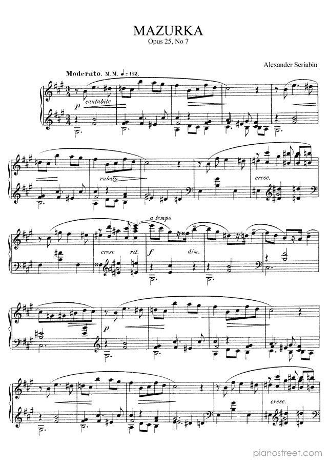 Piano sheet music downloads and recordings. This piece is from Mazurkas by Alexander Scriabin: Mazurka Op. 25 No. 7 in F-sharp Minor (published in 1899) . Level 8, Period: Late Romantic