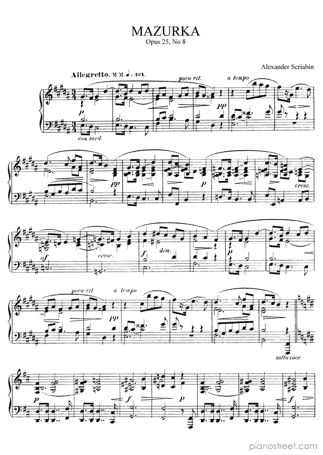 Alexander Scriabin: Mazurka Op. 25 No. 8 in B Minor from Mazurkas - piano sheet music to print instantly. This piece is level 8 and was composed during the Late Romantic period.