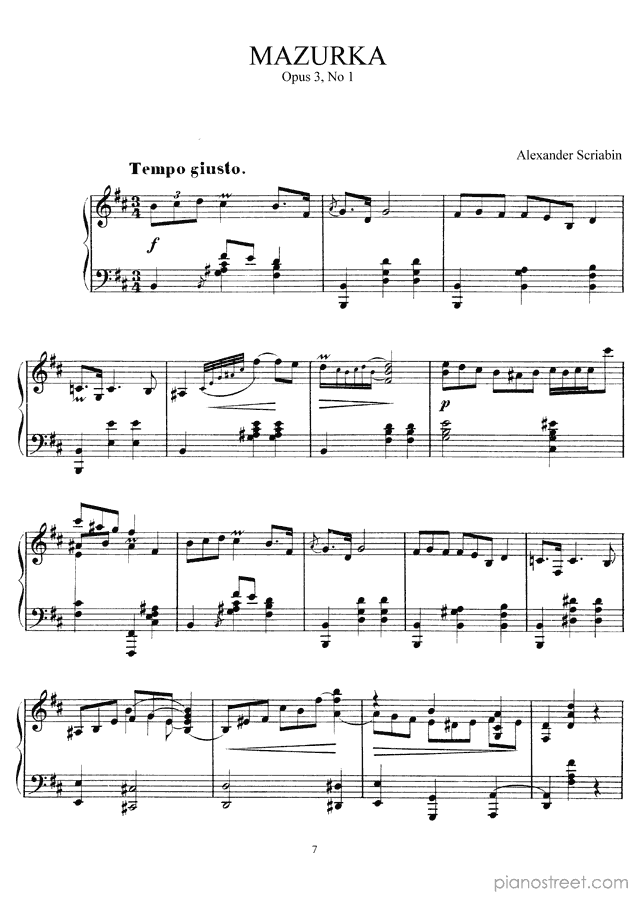 Mazurka in B Minor - Op. 3 No. 1 is a piano piece by the late romantic composer Alexander Scriabin who lived between the years 1872 and 1915.