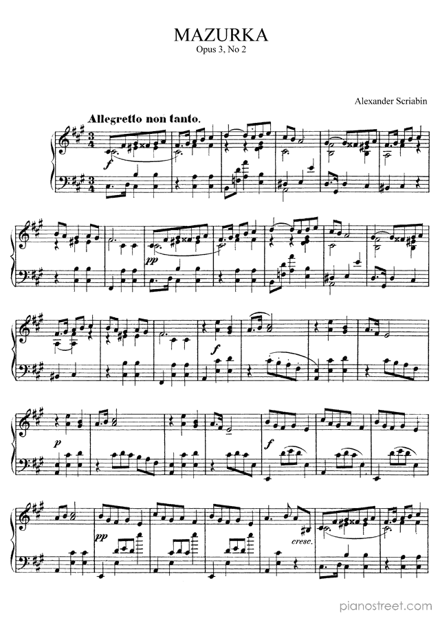 DOWNLOAD: Alexander Scriabin - Mazurka Op. 3 No. 2 in F-sharp Minor ( from Mazurkas by Scriabin). Piano sheet music to print immediately or to view in mobile devices.