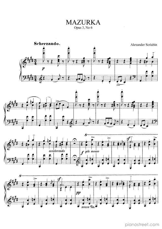 Late Romantic piano sheet music by Alexander Scriabin to download and print instantly: Mazurka Op. 3 No. 6 in the key of . Level 7, composition type: Piece (published in 1889)