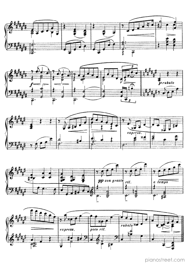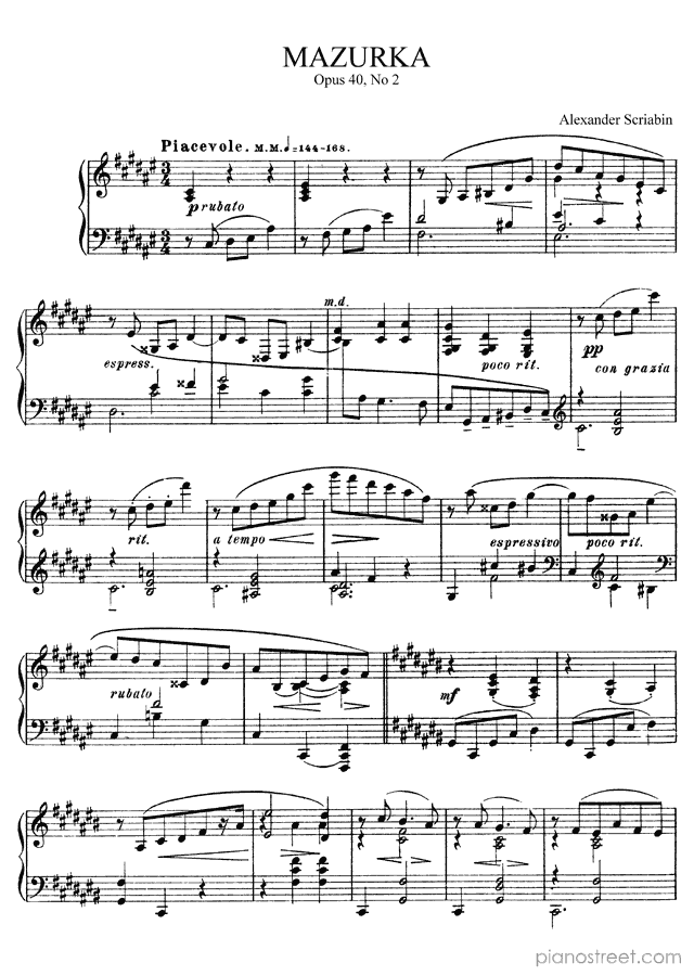 Mazurka in F-sharp Major - Op. 40 No. 2 is a piano piece by the late romantic composer Alexander Scriabin who lived between the years 1872 and 1915.