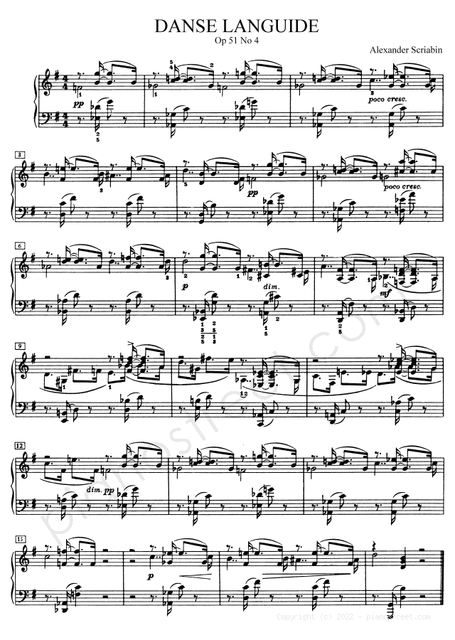Danse languide in G Major Op. 51 No. 4 by Alexander Scriabin. Sheet music and recordings of thousands of piano pieces by Alexander Scriabin and many other famous composers to view in your digital device, print out or listen to.