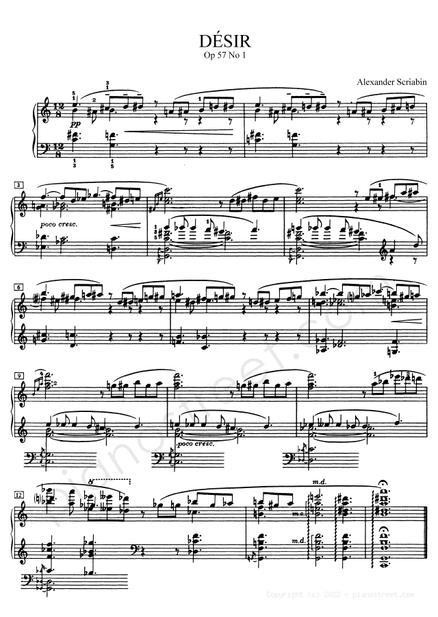 Modern piano sheet music by Alexander Scriabin to download and print instantly: Désir Op. 57 No. 1 in the key of . Level 8, compositional type: (published in 1908)