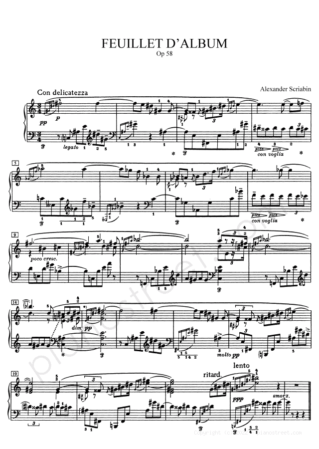 Alexander Scriabin: Feuillet d'album Op. 58 from Poems and Miniatures - piano sheet music to print instantly. This piece is level 8 and was composed during the Modern period.