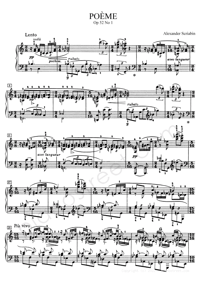 Poéme - Op. 52 No. 1 is a piano piece by the late romantic composer Alexander Scriabin who lived between the years 1872 and 1915.
