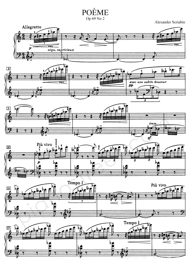 Alexander Scriabin: Poème Op. 69 No. 2 from Poems and Miniatures - piano sheet music to print instantly. This piece is level 8+ and was composed during the Modern period.