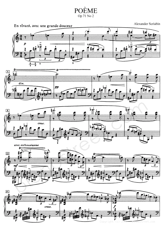 Poème Op. 71 No. 2 by Alexander Scriabin. Sheet music and recordings of thousands of piano pieces by Alexander Scriabin and many other famous composers to view in your digital device, print out or listen to.