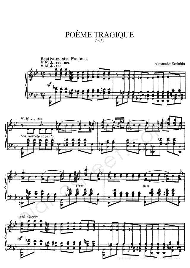 Poème tragique in B-flat Major Op. 34 by Alexander Scriabin. Sheet music and recordings of thousands of piano pieces by Alexander Scriabin and many other famous composers to view in your digital device, print out or listen to.