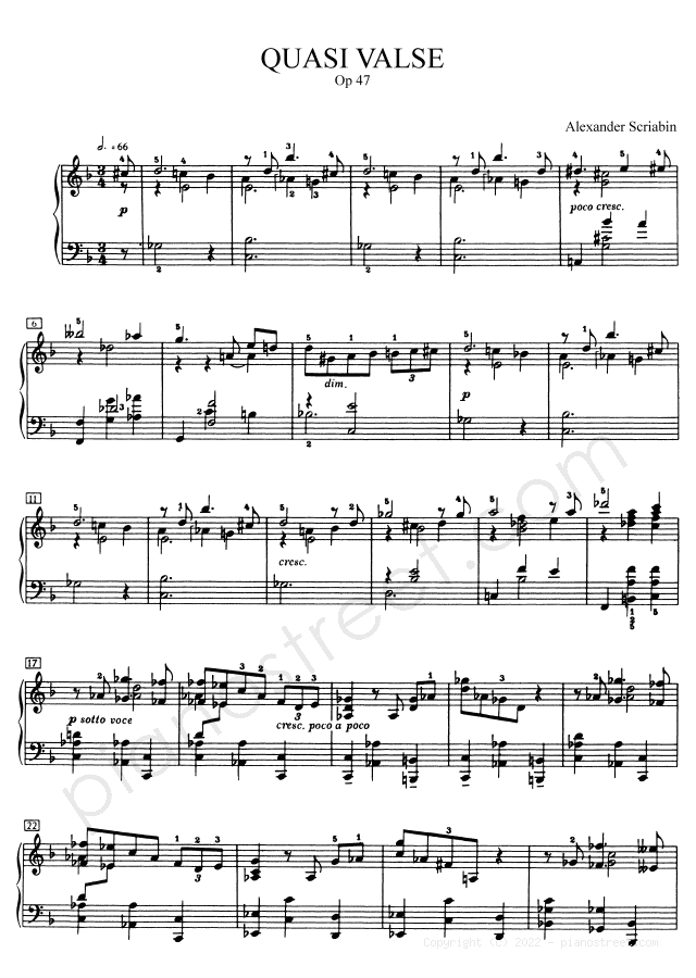 Late Romantic piano sheet music by Alexander Scriabin to download and print instantly: Quasi Valse Op. 47 in the key of . Level 8+, compositional type: (published in 1905)