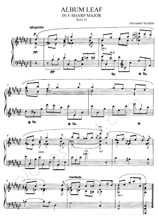 Album Leaf in F-sharp Major - WoO 25 is a piano piece by the late romantic composer Alexander Scriabin who lived between the years 1872 and 1915.