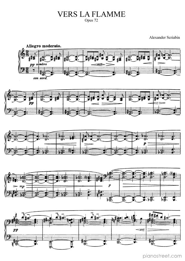 Vers la flamme: Poem - Op. 72 is a piano piece by the late romantic composer Alexander Scriabin who lived between the years 1872 and 1915.
