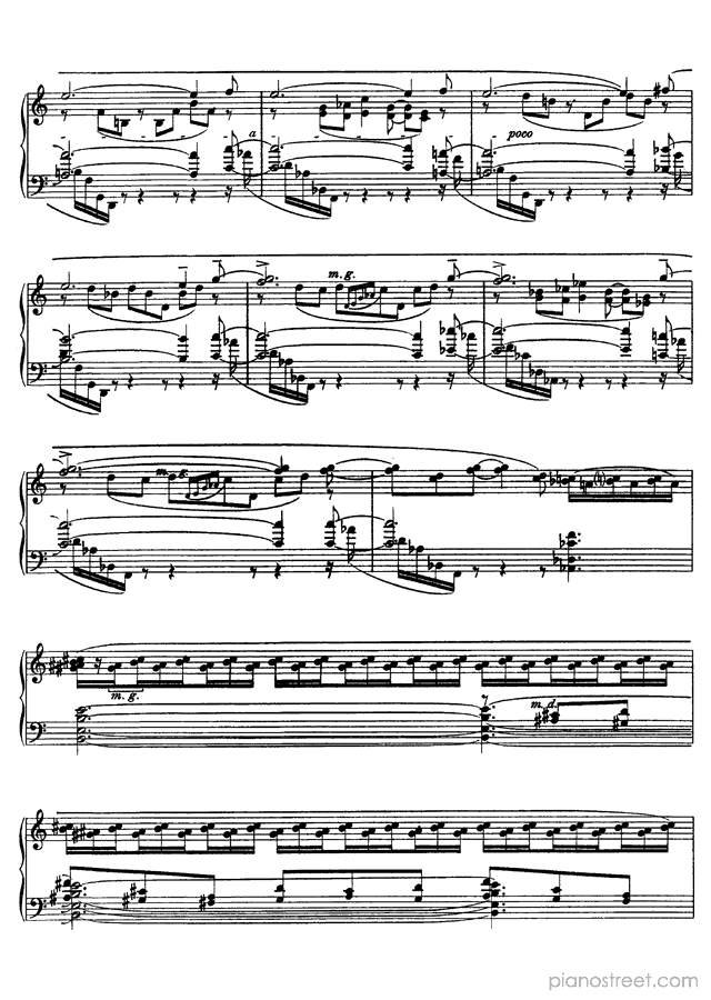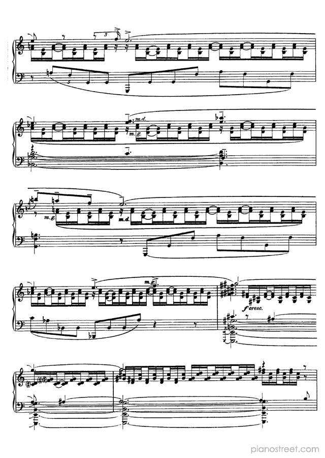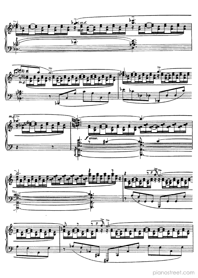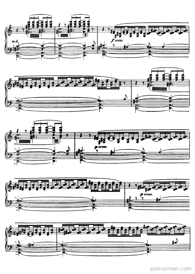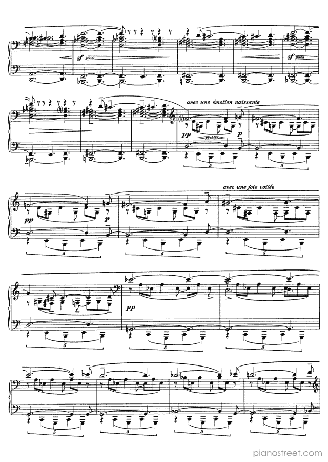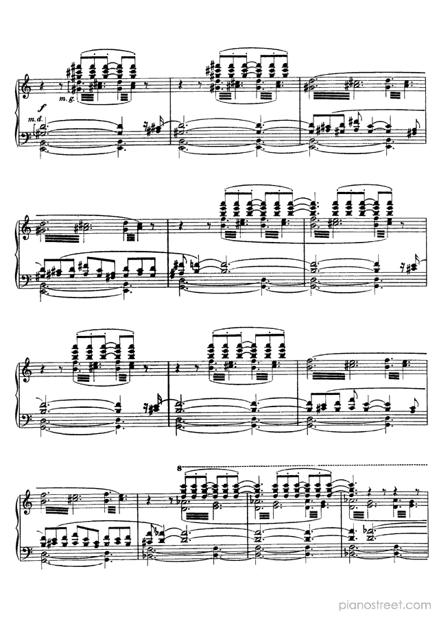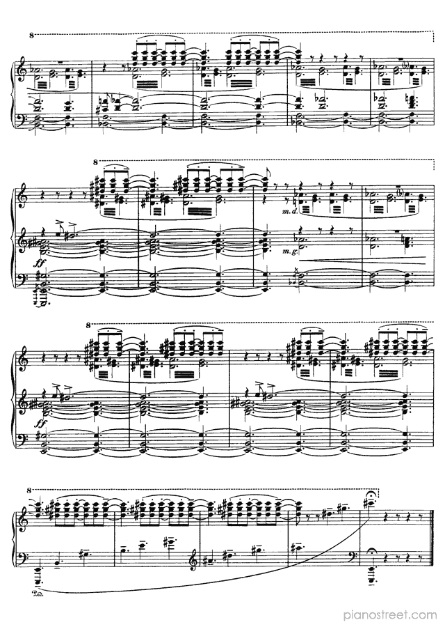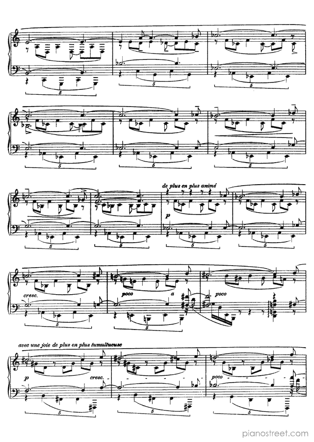 Like many of Scriabin’s late works, this piece is notorious for its difficulty and the physical demands it places on the performer. This piece describes the world’s inexorable slide toward death and destruction by fire. Scriabin firmly believed that the world was storing heat and that it would destroy itself in a conflagration. The half-steps of the main melody stand in for tongues of flame, and the emotional turmoil of the piece signifies the way that fire devours objects and leaves them desiccated and destroyed.Background
