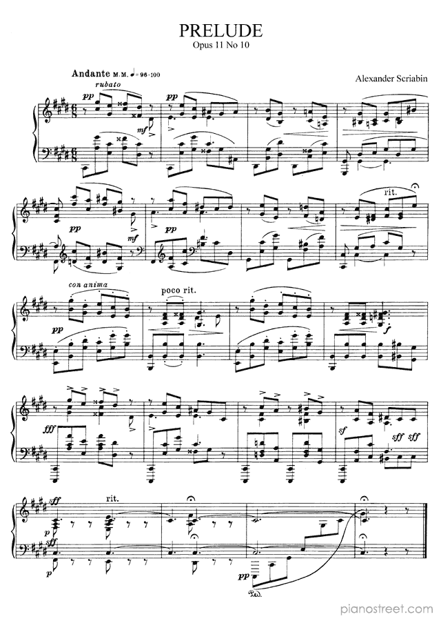 DOWNLOAD: Alexander Scriabin - Prelude Op. 11 No. 10 in C-sharp Minor ( from Preludes by Scriabin). Piano sheet music to print immediately or to view in mobile devices.
